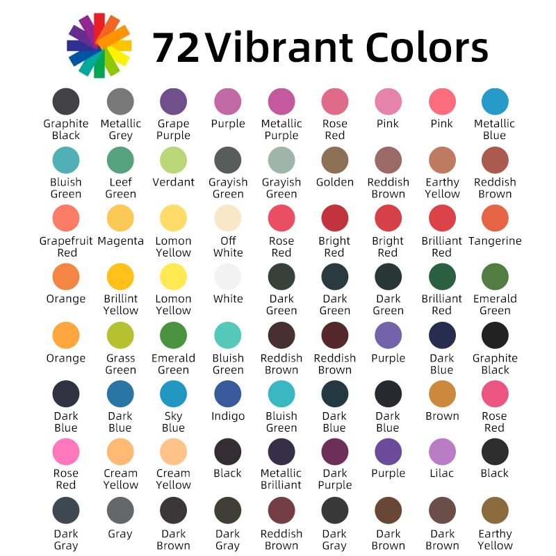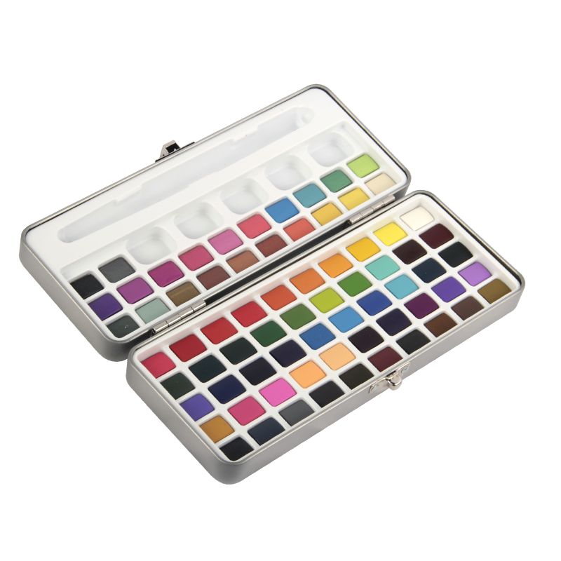 72 रिच र भाइब्रेन्ट कलर,वाटर कलरहरू 72 रङहरू (50 क्लासिक रङहरू, 20 मेटलिक रङहरू, 2 फ्लोरोसेन्ट रङहरू) सँग सेट गरिएका छन्। आफ्नो रचनात्मकता पूर्ण रूपमा अन्वेषण गर्न! वाटर कलर पेन्टहरू कुनै दानेदार अवशेष बिना अल्ट्रा-पिग्मेन्टेड हुन्छन्। र चक्की हुँदैनन्, तिनीहरू अचम्मको रूपमा रिवेट हुन्छन्, राम्ररी मिलाउँछन् र तरल हुन्छन्।